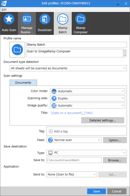 For ImageRamp Batch users, ScanSnap is configured to scan to a specific folder at the touch of a button. Once files are scanned to the folder, ImageRamp Batch can automatically process (or watch) the files for those profiles configured for watched folders or processed on user demand according to the selected profile's setting.
